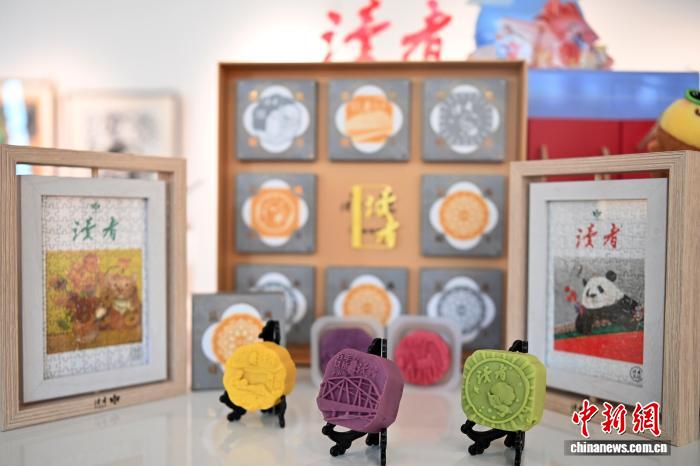 9月29日,甘肃兰州,在读者杂志社展出印有当地历史文化、名胜古迹元素的文创月饼吸引参观者。中新社记者 九美旦增 摄