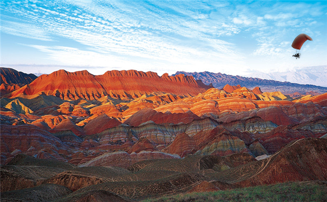 祁连山的雪线渐渐下移,为斑斓的秋色镶上一道银边。张掖丹霞在清冽的空气中色彩愈显浓郁,宛如大自然打翻的调色盘;陇南官鹅沟的层林尽染倒映在碧水之中,构成一幅流动的油画,这里被誉为“陇上小九寨”,是深秋不容错过的秘境。金塔的胡杨正绽放一年中最灿烂的金黄,在湛蓝天空下述说着生命的坚韧。这时的甘肃,处处都是天地挥毫泼就的壮丽诗篇。
