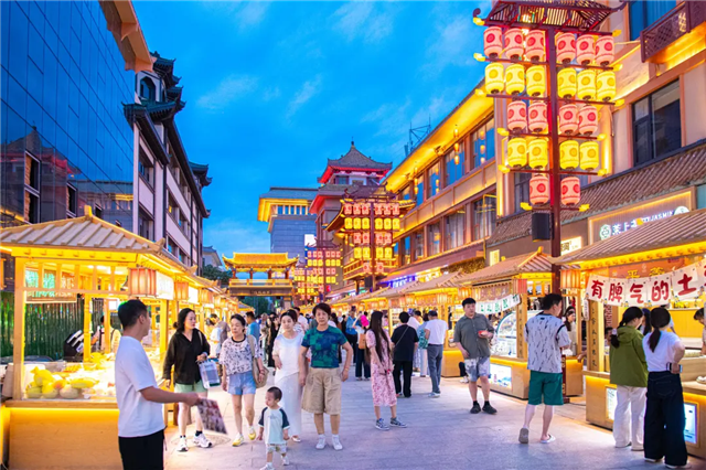 夜幕下的敦煌夜市,烟火气与文化味十足。景观亮化点亮,暖黄灯光温暖明亮,“敦煌集”非遗文创街区里,非遗代表性传承人现场演示剪纸、泥塑技艺,孩子们围在摊位前学捏小骆驼;“敦煌食局”内,烤包子、驴肉黄面等小吃飘香,明厨亮灶窗口前,游客能清晰看到食材制作的过程。