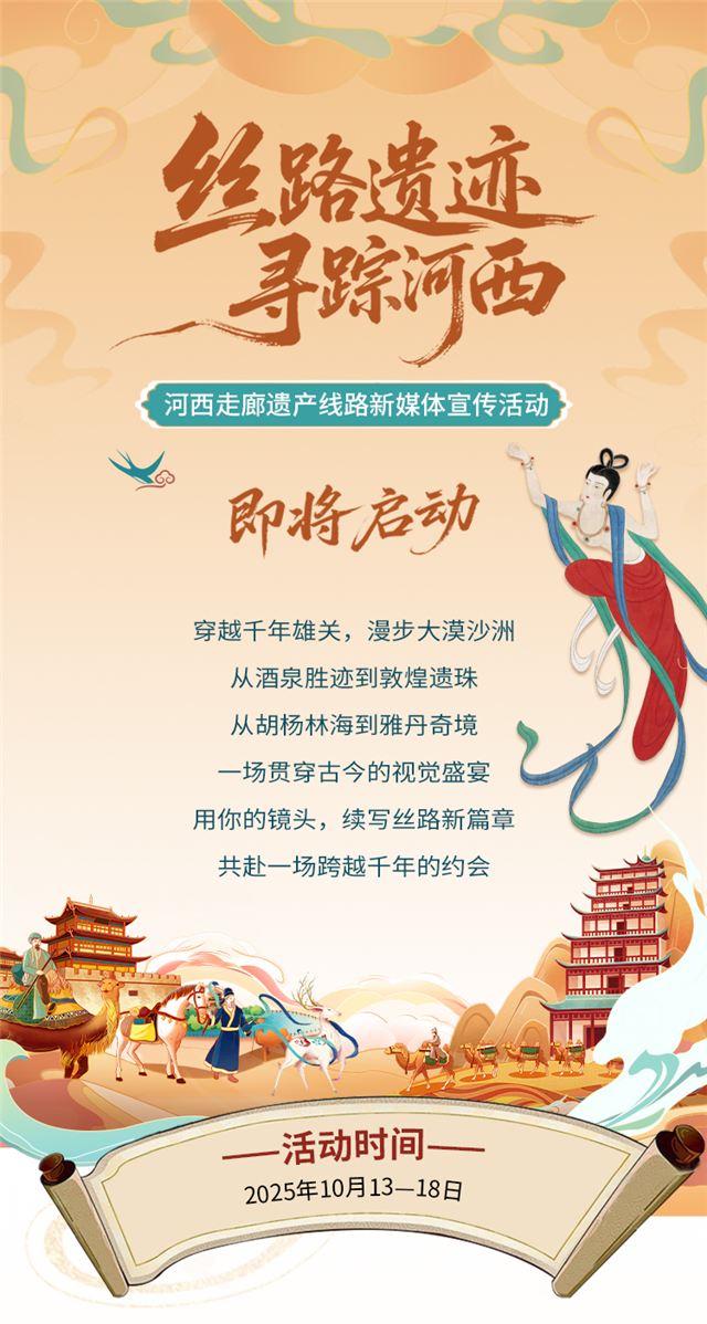 10月13日至18日,由甘肃省文化和旅游厅主办的“丝路遗迹·寻踪河西”河西走廊遗产线路新媒体宣传活动将走进酒泉、嘉峪关等地。活动期间,将组织文化嘉宾、旅游达人及新媒体记者等60余人,深入两市的重点旅游景区、度假区及休闲街区等,通过短视频拍摄、图文新闻、新媒体直播等多种形式,进行全景式、深层次的宣传推广,以创新表达唤醒丝路记忆,助力“河西走廊文旅IP”的现代传播。