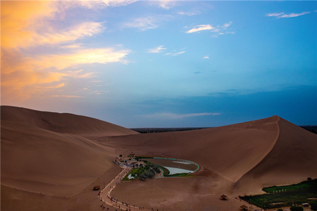 金色沙山在朝阳下泛着柔光,一弯月牙泉如翡翠镶嵌沙丘间,清风拂过带起沙粒轻响。游客或骑骆驼赏大漠风光,或手拉手攀沙山,或在月牙泉畔古柳下驻足,用相机定格“沙水共生”奇景。暮色渐浓,“万人星空演唱活动”拉开帷幕。舞台搭在沙山脚下,背景是漆黑天幕下的月牙泉轮廓,数盏射灯光束与星光交织。