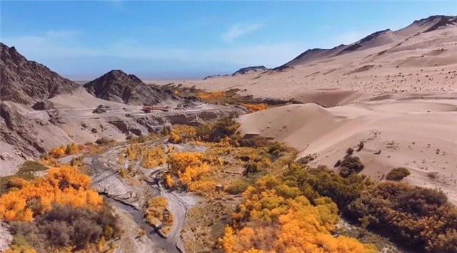 藏在阿克塞县西北90公里峡谷中的多坝沟胡杨峡,是“被风沙偏爱的秘境”。野生胡杨沿峡谷肌理蜿蜒,虬枝盘曲如岁月镌刻的诗行,清溪潺潺从树下流过,将胡杨的金黄、沙山的黛青、天空的湛蓝揉成一幅流动的画。这里曾是《东宫》里的苍凉背景、《英雄》中的打斗秘境,每一棵胡杨都似带着故事,风一吹,枝叶簌簌仿佛在诉说丝路过往。