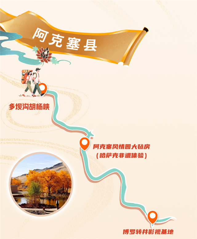 阿克塞县民族风情园,以哈萨克民族文化为主题,由哈萨克大毡房、民族工艺街、哈萨克民族博物馆等景观构成,园内哈萨克民族博物馆建筑面积4238平方米,陈列1200余件展品,设有“哈萨克历史文化展”和“阿克塞野生动物标本展”两个基本陈列,赛马场占地20.88万平方米,具备国际标准赛道和马术表演场。园区与博罗转井影视基地、库姆塔格沙漠公园等景点形成联动旅游线路。通过非遗展馆、文创产品开发等方式展示哈萨克族历史文化和民俗风情。