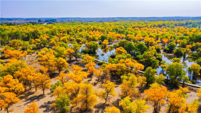金塔县,地处巴丹吉林和库姆塔格两大沙漠之间,共有400多个风沙口,是全国荒漠化最为严重且受风沙危害最严重的地区之一。在如此严峻的自然环境下,胡杨林成为这里一道特别的风景线,它们像饱经沧桑的老人,精神矍铄,从容淡定,在秋天到来之际,为秋景添上了浓墨重彩的一笔。当大漠旷野吹过一丝清凉的秋风时,胡杨林便在不知不觉中,由浓绿变为浅黄,继而变成杏黄了。每一棵高大的胡杨树冠枝头,间或又有浅绿、淡黄的叶片在闪现,错落有致,色彩缤纷。秋风乍起,胡杨金黄的叶片,飘飘洒洒“哗哗”地落到地面,大地铺上了金色的地毯,辉煌而凝重。