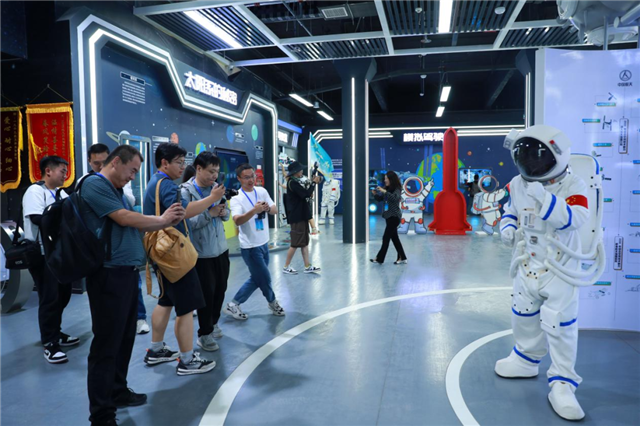 酒泉市1969航天科技体验馆,游客身穿航天服打卡拍照。陈坤/摄