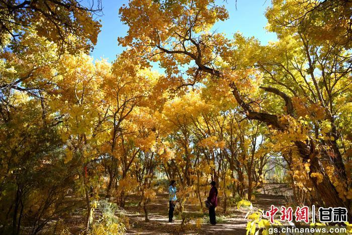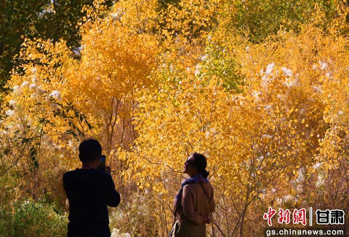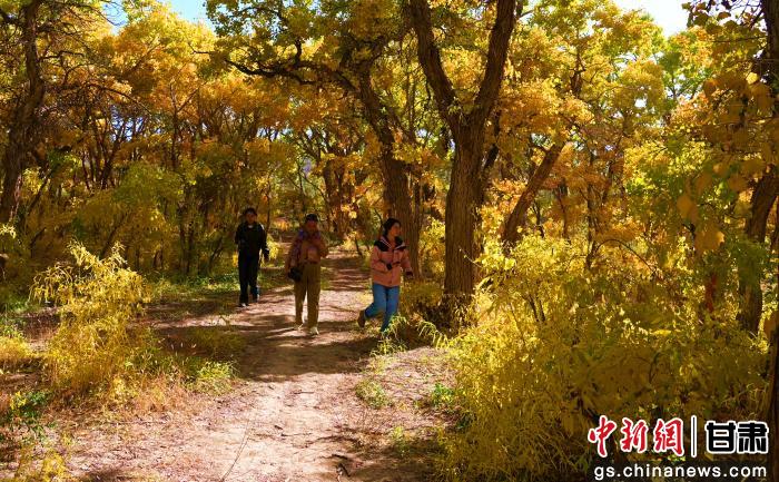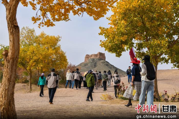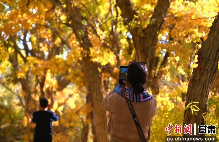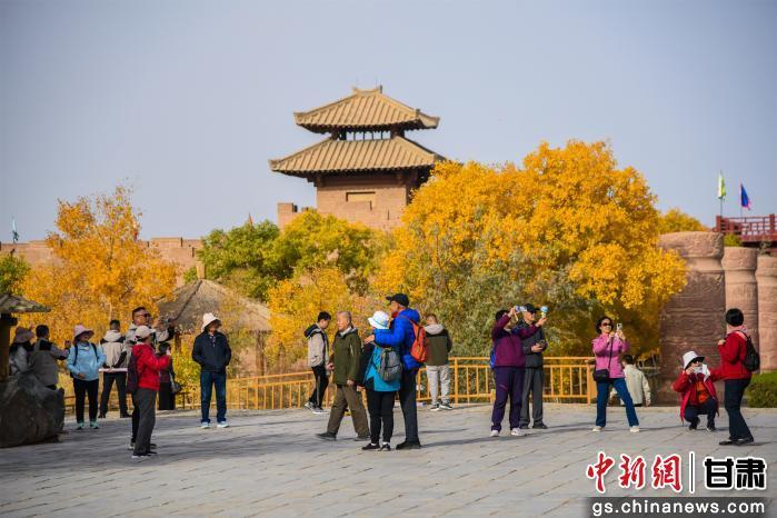 10月上旬以来,位于甘肃省敦煌市莫高镇的一片胡杨林被秋色浸润,宛如油画,分外迷人,吸引游客前来打卡拍照。同时,敦煌阳关脚下金色胡杨亦如诗如画,吸引众多游客前来游玩、赏景。(张晓亮 王斌银 王明妍)