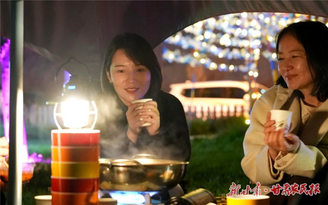 当夜幕降临,露营地的“烟火气”愈发浓郁,热闹得挤不动道。营地内,“围炉帐篷”一座挨着一座,每顶帐篷前都坐满了游客,大家围着暖炉,手里捧着热气腾腾的饮品,等待着香煎小银鱼、黄河鱼养生火锅上桌,服务员端着餐盘在人群中灵活穿梭,不时回应着游客的点餐需求;每周五、周六晚的民谣专场,本土歌手将会唱响《黄河谣》等曲目,并开放现场点歌互动;“篝火映歌”傩舞晚会中专业舞者将引领众人围火共舞;露天电影区则提供一片温馨天地,分享观影照可兑换暖心小食。