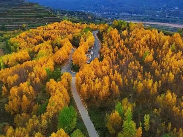 山梁沟壑之间,公路两旁的杏树与杨树早已将满腔秋意尽数泼洒,满枝满桠的金黄在风中摇曳,又完整倒映在雨后如镜面般洁净的路面上——那澄澈的倒影与枝头的金黄相映,仿佛将秋日的明媚叠了两层。当车轮缓缓碾过,眼前的金黄光影随车身流动,人仿佛不是行驶在公路上,而是步入了一幅鲜活又浓郁的金黄画卷里。