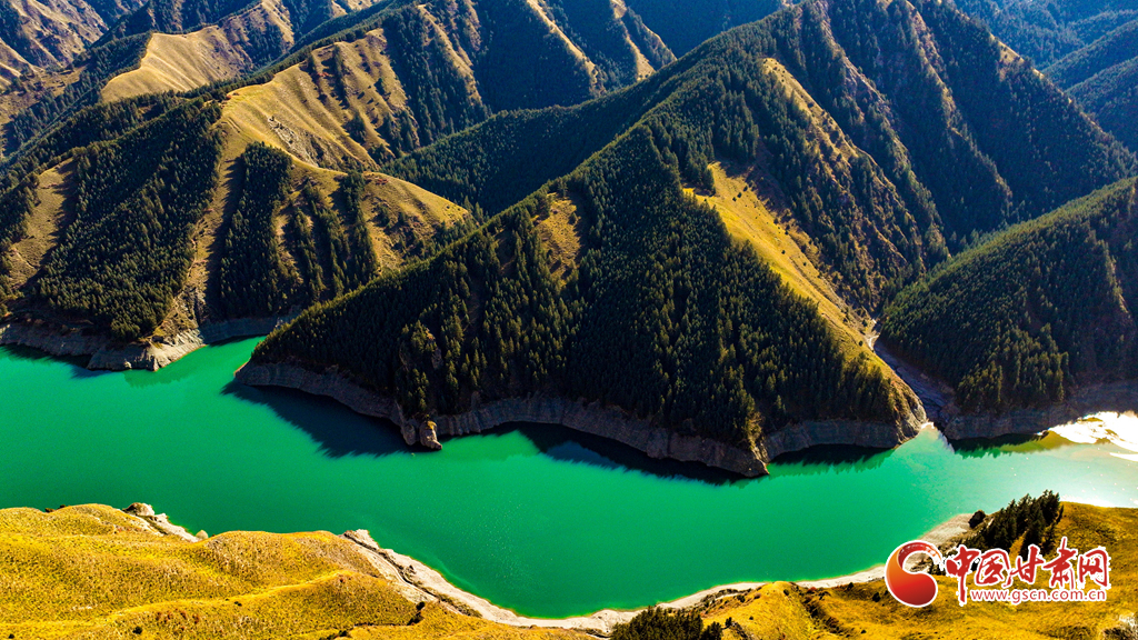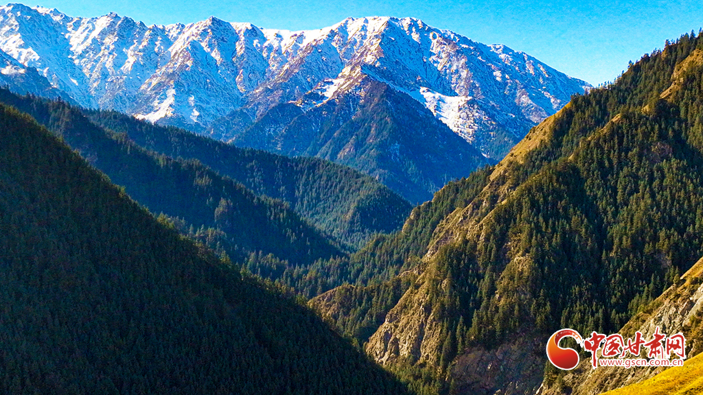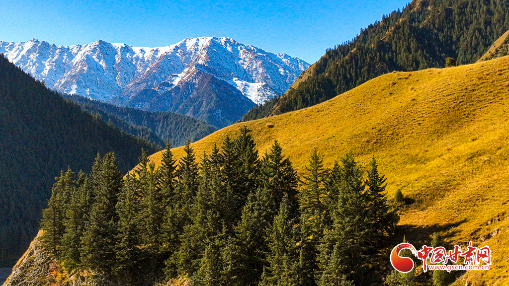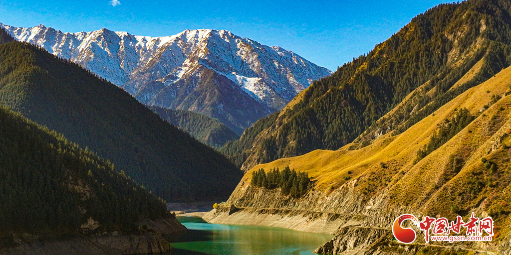 近日小雪初霁,祁连山国家公园张掖市民乐县境内的海潮坝段,在阳光下焕发新颜。阳光洒落,为雪峰披上耀眼金衣;群山静默,倒映于碧绿的黑河水之中。岸边苍松翠柏耸立于原始森林,与金色的草甸交织连绵,共同绘就一幅雪后国家公园的壮丽画卷。