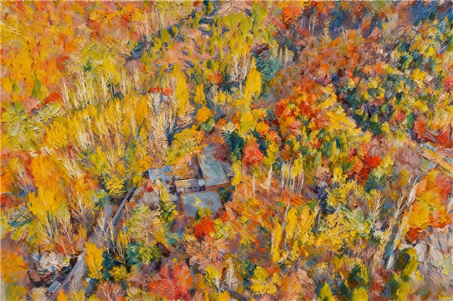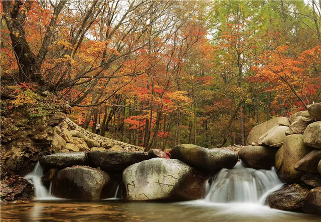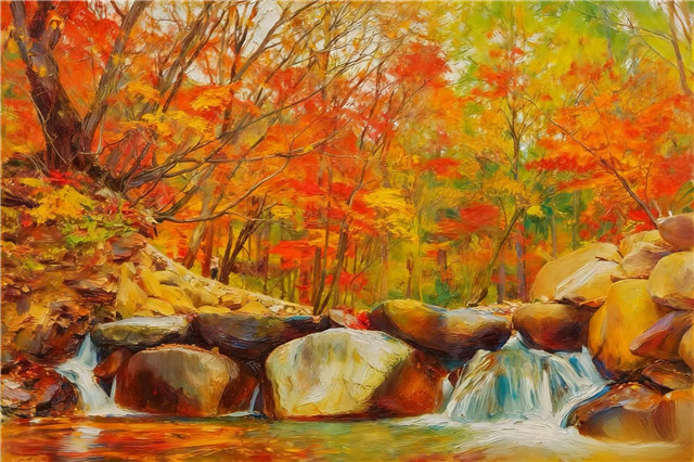 这里演绎着光影与色彩的协奏。源头的飞瀑冲破一片赭黄与深红,溅起的水珠在阳光下晶莹剔透。沿木栈道深入,脚下是沙沙作响的落叶地毯,阳光透过已变为金黄与鎏金的白桦林,在布满青苔的岩石上投下斑驳的碎影。潺潺溪流将岸上所有的斑斓——熟褐的土、明黄的叶、蔚蓝的天都收纳其中。空气中混合着潮湿泥土与枯叶的醇香,每一步都像在画中漫游。