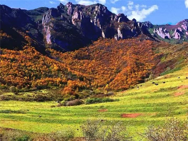若说贵清山是浓墨重彩的油画,黄香沟便是铺展在高原上的斑斓织锦。秋日褪去盛夏的翠绿,晕染开浅黄、橙黄与深褐的渐变,成群的牛羊散落其间,如同缀在织锦上的墨色斑点,悠闲啃食着最后的青草。而边缘的落叶松林,早已换上金黄盛装,阳光穿过笔直的树干,在地面投下细密的光网,踩上去是松针簌簌的轻响。远处的山峦轮廓柔和,覆着深浅不一的林带,与天空的淡蓝、草原的暖黄构成和谐的色块,风过时,林海与草原一同起伏,奏响一首辽阔而宁静的秋日牧歌。