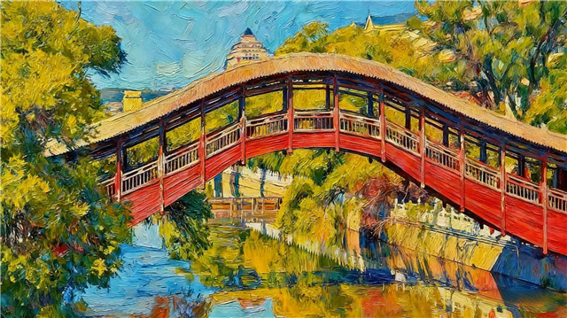 这座古老的廊桥,在秋天成了连接现实与画境的通道。桥身的深褐色调与秋林的暖色系浑然一体。立于桥上,可见湛蓝的秋空为幕,斑斓的林木为景,廊桥优雅的倒影静静卧于如镜的河面。秋风掠过,水面涟漪微起,倒影中的色彩便荡漾开来,模糊了现实的边界,宛若一幅笔触细腻的点彩画。晨昏时分,低角度的光线为这一切镀上暖金色的边框,美得令人失语。