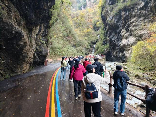 10月19日,踩线团的行程转向官鹅沟大景区。金秋时节的官鹅沟景致浓烈,澄澈的碧水映照着绚烂彩林,峡谷间云雾若隐若现,将秋日的诗意演绎到极致。踩线团还乘坐了雷古山索道,随着轿厢缓缓攀升,脚下层林尽染的林海交织成壮阔画卷,秋日山野的雄浑与灵动一览无余。