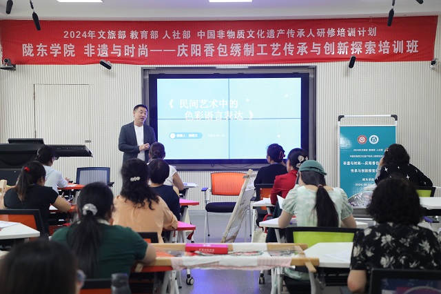 陇东学院于2020年成为中国非遗传承人研修培训计划参与院校,近年来,结合区域优势与办学特色,逐步摸索出“专家+大师+交流+创新”四位一体的研培模式。学院与环县非遗保护中心(道情皮影戏)、庆阳市香包民俗文化产业协会(香包绣制)达成合作共建关系,组成教师团队,完成皮影戏研培教学2期,培训学员55人,排演红色原创影戏《陇原第一枪》1部;完成庆阳香包绣制工艺传承与创新探索培训班1期,培训学员30人,呈现“以非遗绣非遗二十四节气图系列作品展”一场。自承担非遗研培项目以来,完成相关国家级课题立项2项、省部级课题6项。(文/甘肃省文化和旅游厅 高海)