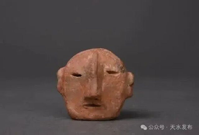 除了女性的笑,在天水出土的古代雕塑中也有男性憨厚的笑容。新石器时代马家窑文化石岭下类型红陶人头形陶塑,长6.8厘米,宽5.5厘米,高6.2厘米,现收藏于天水市博物馆。这件人面陶塑为泥质红陶,中空,手工捏制,人像面部扁平,鼻梁高挺,两眼平直,嘴角含笑,显得憨厚朴实,稳当可靠。