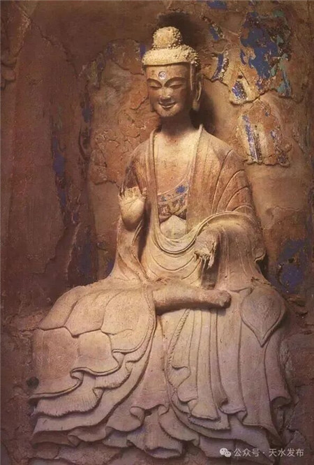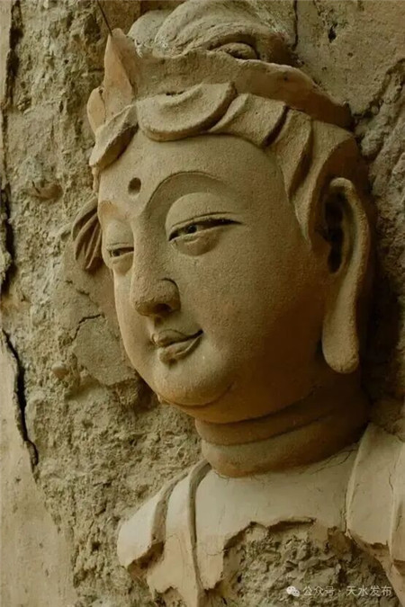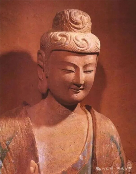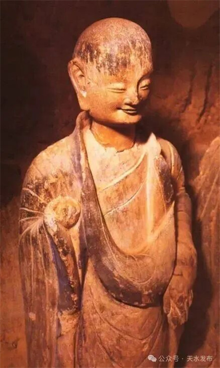 在魏晋南北朝时期,随着佛教的传入,天水佛教造像中不仅继承了天水传承千年的高超雕塑技艺,更将微笑表情与“法喜”义理完美结合,创造出了迷人且打动人心的微笑元素,并形成了这一时期具有独特审美的“东方微笑”意蕴。