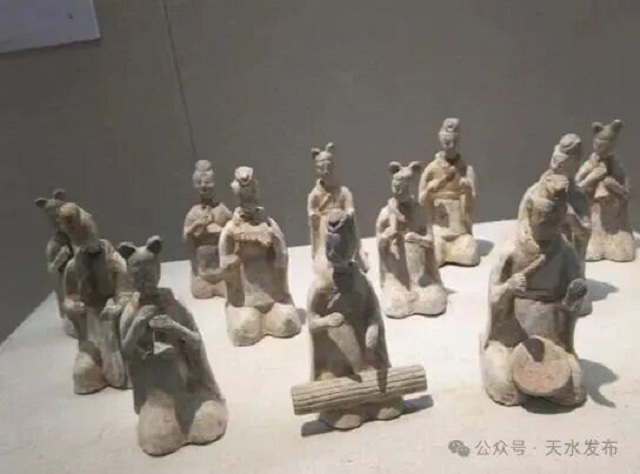 清水县博物馆收藏有一套北魏彩绘陶乐俑,一组12件,乐队成员身着统一装束,男乐师发髻高挽,头戴小冠显得英武干练,女乐师则梳双环髻颇见端庄秀丽。他们身穿交领短襦,腰系长裙,跽坐于地,吹奏鼓、瑟、排箫、角、筚篥等各式乐器,形成了一个座部伎乐乐团。最惹人注目的当是陶乐俑面部呈现的热情洋溢的笑容,虽历经千年但依然给观者以强大的感染力。