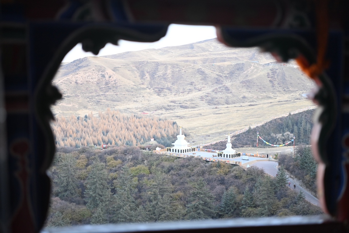 马蹄寺石窟景区的塔尔梁上两座白塔。
