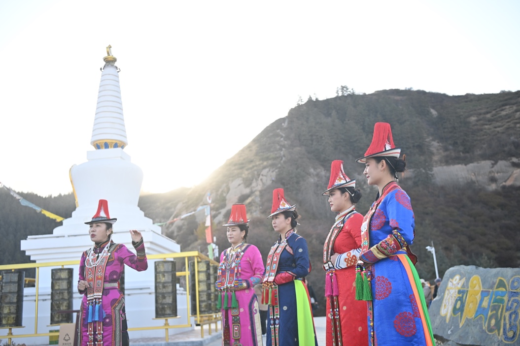 马蹄寺景区里裕固族姑娘介绍当地民族服饰文化。