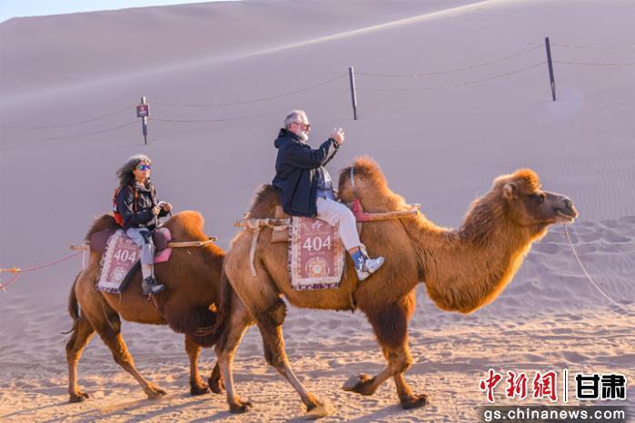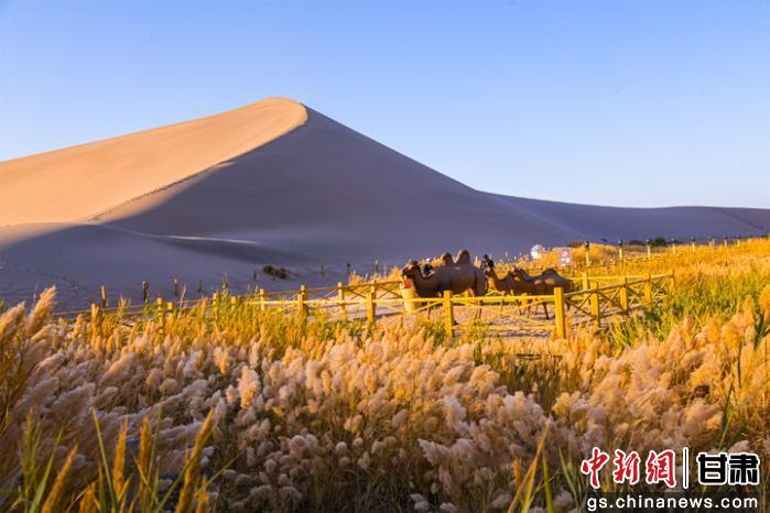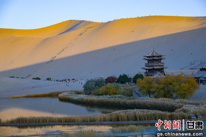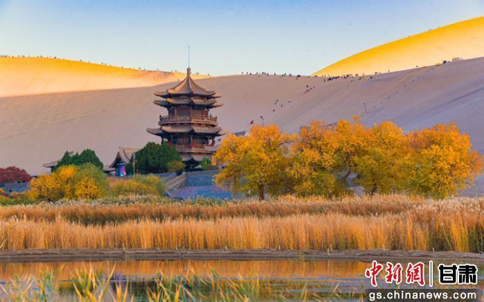 11月初,甘肃省敦煌市鸣沙山下秋色正浓,金色的大漠,金黄的胡杨,摇荡的芦苇,叮当作响的驼铃,一幅幅醉人的塞上风光画卷,吸引众多中外游客前来静享敦煌大漠里浪漫迷人的秋色。(王斌银 周玉玲)