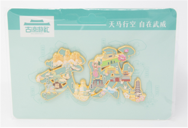 冰箱贴采用武威二字作为主体框架,冰箱贴表面融入马踏飞燕、天梯山石窟、鸠摩罗什寺塔等武威元素,底蕴深厚。