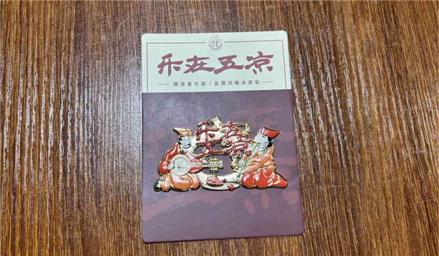 “乐在五凉”文创冰箱贴以甘肃河西出土魏晋画像砖宴饮、娱乐图案为创意来源,体现了五凉文化蕴含的兼容并蓄、包容开放、多元一体的中华文化特征。