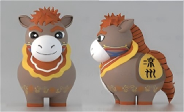 设计以铜奔马为原型,将其矫健奔腾之姿生动呈现。色彩上,汲取武威自然与人文景观中的丰富色调,如大漠黄沙的金黄、祁连山脉的翠绿等,象征着武威自然风貌的多彩与历史文化的厚重。