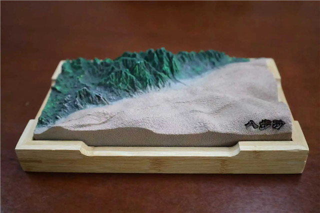 采用八步沙的沙子,通过3D打印技术打印而成,一半沙漠,一半绿洲。