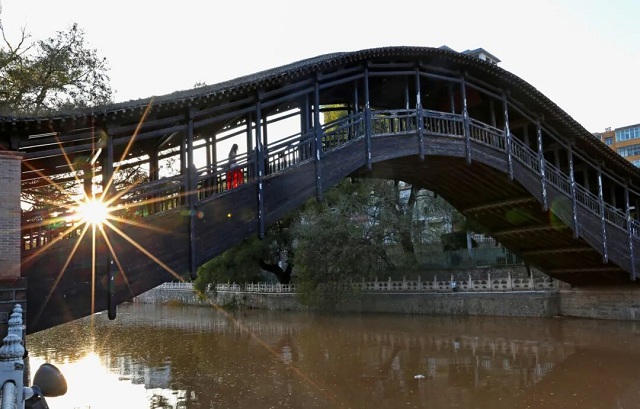 始建于明洪武年间的渭源灞陵桥是其中的杰出代表。全长约40米的桥身,凭借64根吊柱与11组圆木叠梁拱接而成。其“鱼鳞榫”工艺巧妙利用木材热胀冷缩的特性,实现构件的自紧密合,成为国内罕见的纯木质叠梁拱桥典范,也是宋代《营造法式》技艺在西北地区的珍贵遗存。