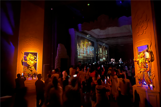 “行进式演艺不同于常规的镜框式舞台演艺,在场景转换中弱化了故事性,用剧中主角引导观众行进,需要观众更多自主地去体验场景,每次看都能有不同的感受。”张华说,一部剧需要人物故事线索,但又不能太复杂。《乐动敦煌》以音乐天才白歆追寻音乐梦想,在敦煌壁画中寻得人生真谛的故事为主线,其中有求索、迷茫、坚定,让这部剧有了情感的厚度。在张华看来:“沉浸式文旅产品不仅是视觉360度全方位的沉浸,也一定是情感的深度沉浸,让观众真正融入场景铺垫的情绪中,产生共鸣。”