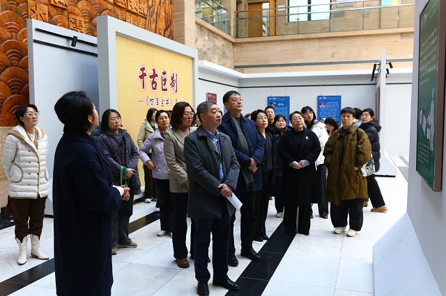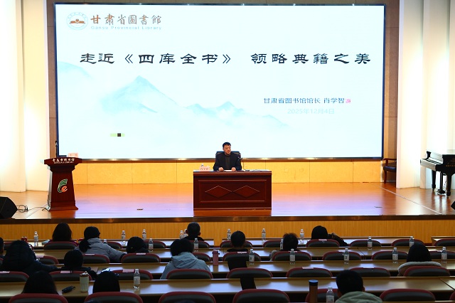 此次展览以《四库全书》编纂渊源与存藏流传为核心,集中呈现其历史命运与文化价值,讲解员通过细致讲解引导参观者多维领略这部“典籍总汇”的魅力。期间,肖学智以“走近四库全书 领略典籍之美”为题授课,系统阐释《四库全书》缘起编纂、七阁流传及文溯阁本独特价值,并结合“创意四库”案例,分享传统典籍在新时代公共文化服务中的创新转化路径。甘肃省图书馆还与青岛市图书馆就古籍修复保护、人才培养、资源共享及省际合作机制等方面进行交流探讨并达成初步共识。