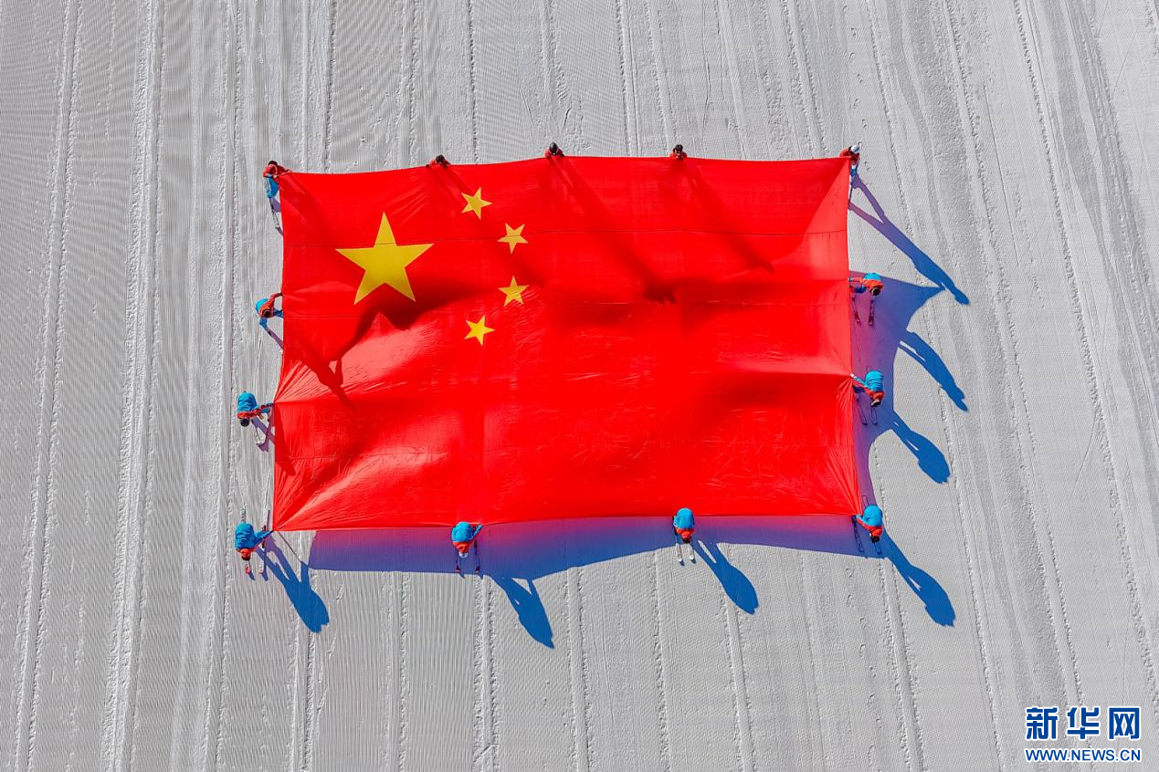 滑雪教练员手举国旗从专业雪道滑下。(甘肃省文化和旅游厅供图)