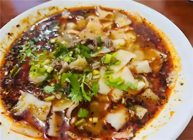 在陇西县的老字号面馆里,师傅正现扯担担面,面条柔韧劲道,浇上炝香醋汁与焦脆辣椒,再添一勺卤肉卤汤,早起的食客总爱加块卤蛋或卤肠,让酸辣鲜香直冲天灵盖。