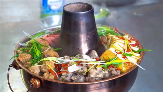 定西暖锅冒着腾腾热气——铜制火锅里,底层铺着耐煮的豆腐、宽粉和土豆,中层码上腊肉、手工丸子和五花肉,上层盖着新鲜时蔬,浇上慢熬的鸡汤,炭火加热后咕嘟冒泡,香气交融。