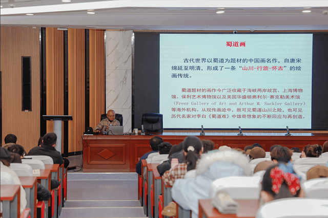 当天下午,由四川大学吴永强教授主讲的《诗画互文:古代蜀道绘画名作》蜀道主题讲座在天水师范大学举行,该校师生近200人参加了讲座。讲座以李白《蜀道难》入题,进行了古代蜀道题材诗作与书画名作的赏析,提出了蜀道画作四种经典图式的观点,启发听众对于主题创作、艺术表达等方面的深刻思考。
