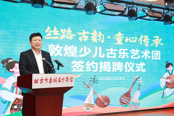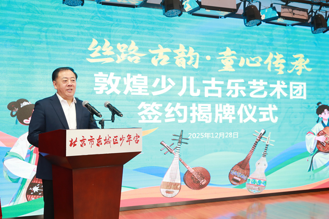 2025年12月28日,北京市东城区少年宫与甘肃演艺集团文旅产业发展有限公司联合创办的“敦煌少儿古乐艺术团”在京正式揭牌成立。此次合作是京陇两地文化教育资源深度融合的重要举措,旨在推动敦煌古乐、敦煌舞等艺术在青少年美育领域的传承与发展,为中华优秀传统文化注入新时代活力。