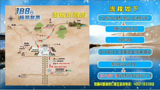 推荐游览线路:中门检票入园→步行至鞋套租赁处领取鞋套→大漠乘驼处乘骑骆驼(环线)→登鸣沙山、赏月牙泉→小泉湾广场乘坐观光车返回中门山门广场→圆满结束游览。