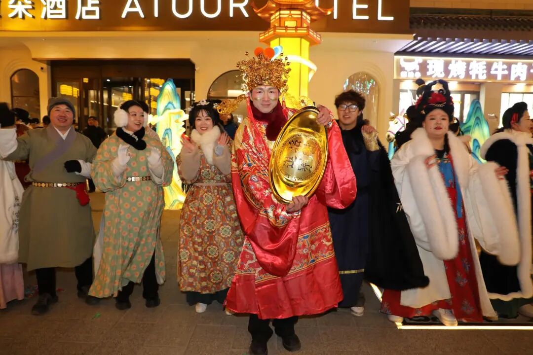 敦煌灯会不仅复刻了壁画中的经典灯景,更创新推出“灯会银票”互动机制,10万张融合敦煌壁画元素的特色银票既是精美纪念品,也是参与互动活动的“通关密码”。身着仿古服饰的乐伎、手托宝盘的商贾、英姿飒爽的张骞骞将军、送财的“财咚财”等NPC穿梭灯海,通过舞蹈演绎、情景互动等方式向市民游客赠票。市民游客凭银票参与丝路博戏、胡旋争艳、丝路毽影、河西点兵、方城会友答等多项体验,集齐印章即可兑换敦煌特色文创礼品,让文化体验可感可携。
