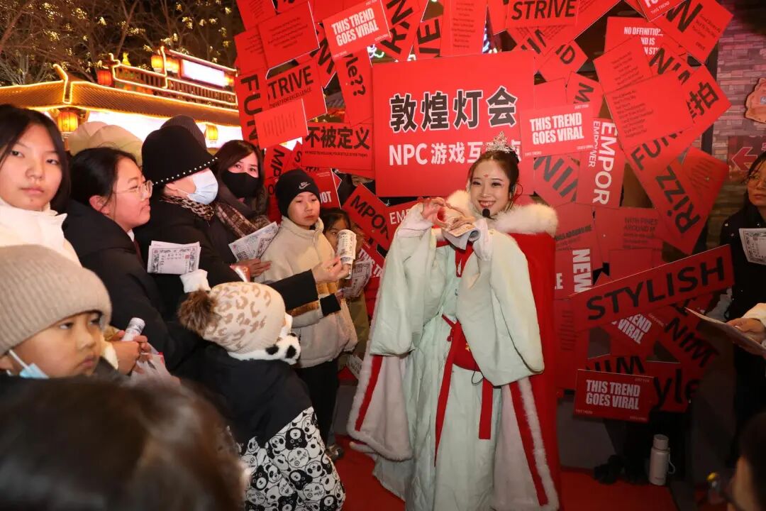 敦煌灯会NPC阿云说:“我带大家跳了很多有趣的舞蹈,大家积极性也挺高,今天是跨年夜,希望大家明年越来越好,新的一年多运动,身体倍儿棒。”