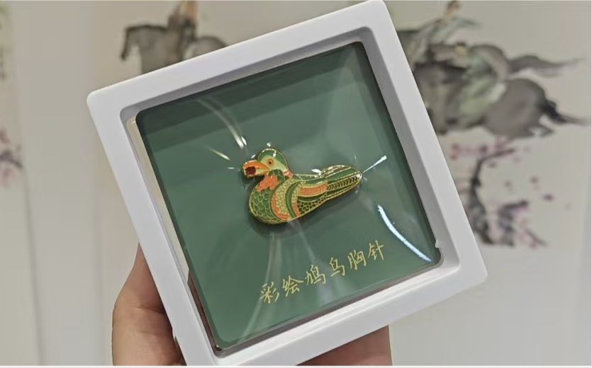 胸针复刻了文物的经典造型,珐琅彩工艺勾勒出鸠鸟的斑斓纹理,金属镶边还原出器物的精致质感,将汉代凉州的工艺美学与文化意涵,凝练成一枚可佩戴的随身藏品。