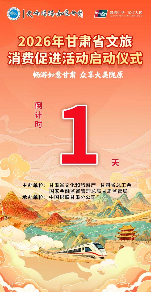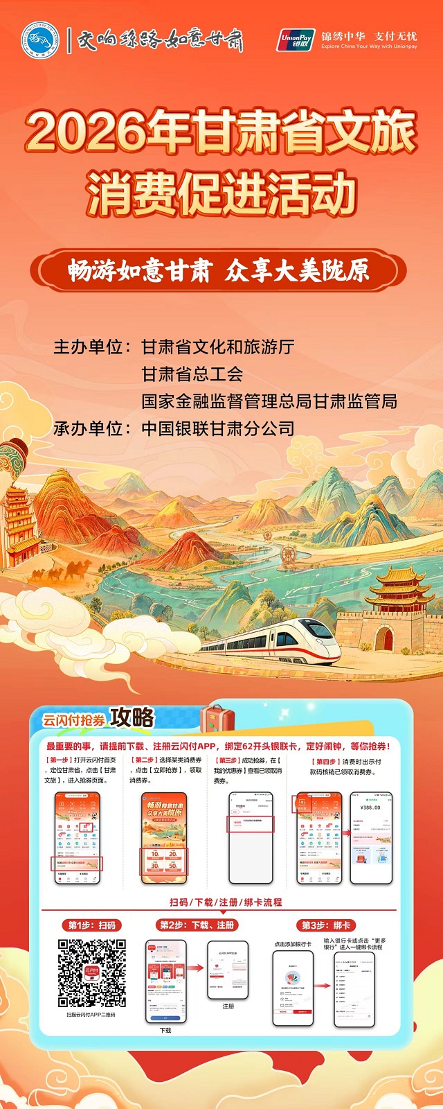 倒计时1天!“畅游如意甘肃 众享大美陇原”2026年甘肃省文旅消费促进活动将于1月8日在兰州启动。活动期间,每日上午9点发放文旅消费券,其中:50元、100元、200元档消费券,每位消费者每日可领取并核销1张,每月限领并核销4张;300元档消费券,每位消费者每周可领取并核销1张,每月限领并核销4张。另外,消费者在12306APP、兰州市养老助餐指定商户使用银联二维码或线上选择云闪付完成支付时,即可享受满10元立减2元优惠,每个用户每日限享1次优惠,每月限享10次优惠。