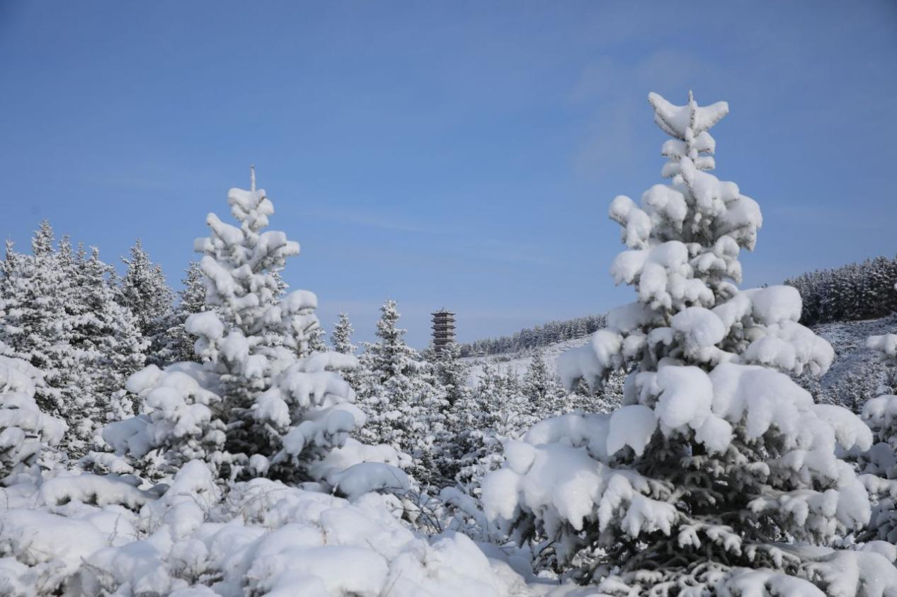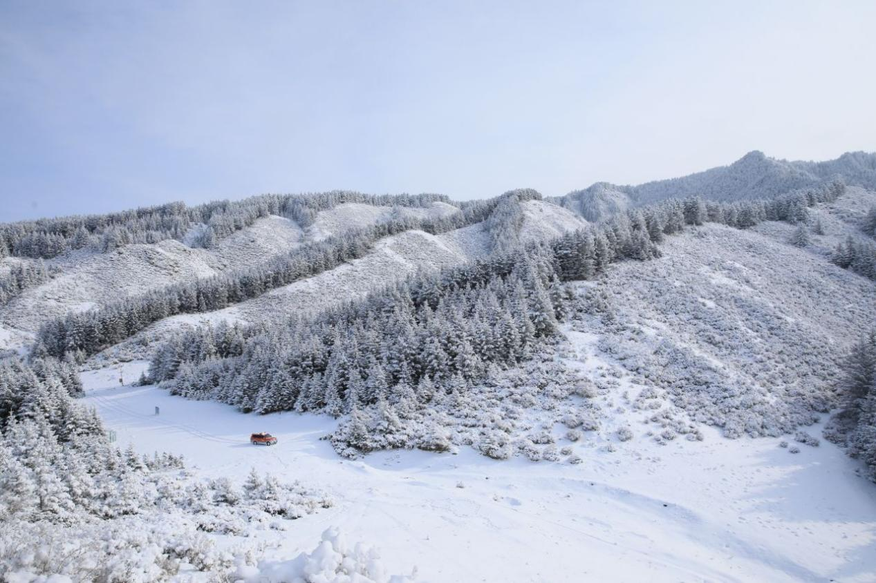 这座承载着“失我焉支山,使我妇女无颜色”千年慨叹的名山,此刻松枝缀满晶莹雾凇。阳光斜照,折射出五彩流光,宛如古战场的胭脂化作冰晶,藏于枝桠间。山间古寺红墙在白雪映衬下愈发庄重,钟鸣声穿过雪雾悠远绵长,与积雪坠落的簌簌声,合奏出冬日独有的静谧乐章。偶有岩羊踏雪而过,蹄印浅浅,为这仙境添了几分灵动,仿佛是山林的精灵在守护这份宁静。