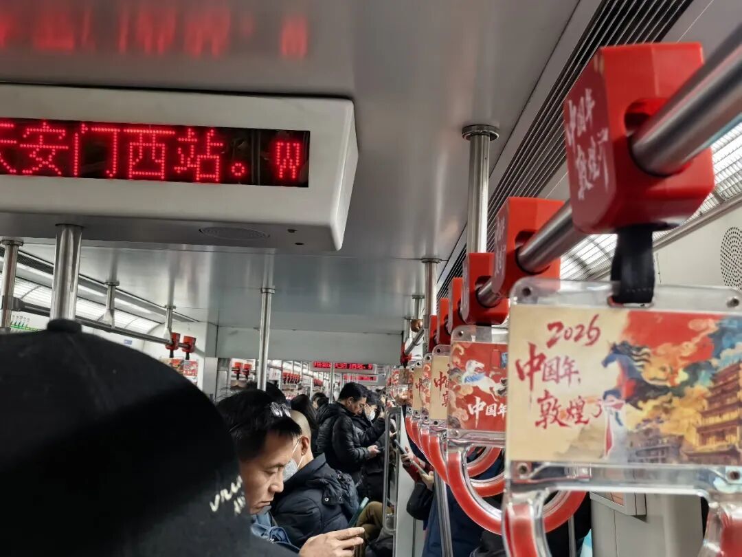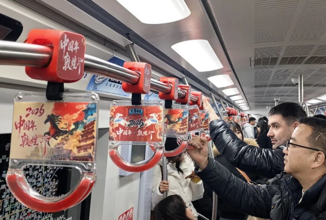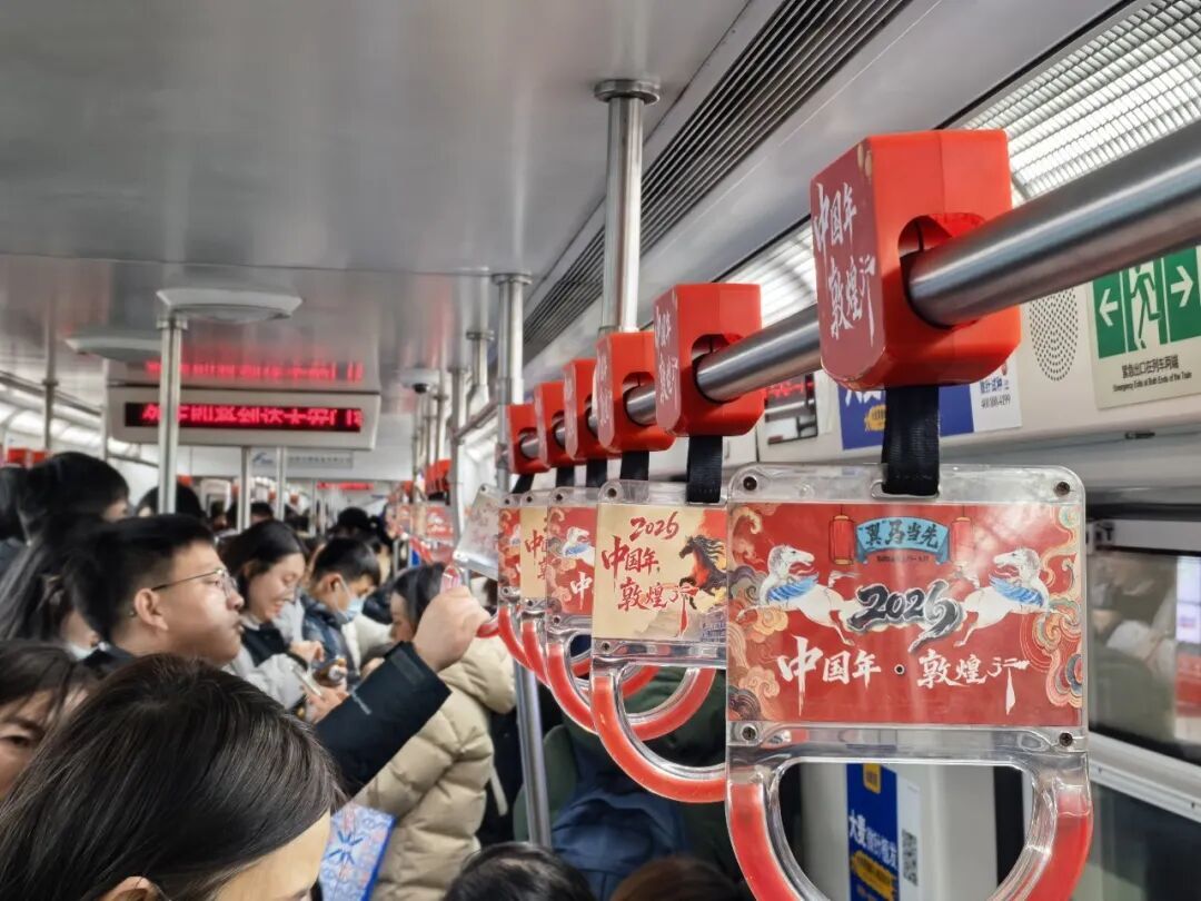 近日,北京地铁车厢内的拉手悄然焕新,浓郁的敦煌元素铺陈开来,将大漠敦煌的千年东方美学与新春的喜庆氛围巧妙融合。以“中国年・敦煌行”为主题的文旅宣传正式进驻北京地下交通脉络,在春运大幕即将拉开之际,向往来首都的八方旅客及北京市民,递出一份来自丝路敦煌的新春盛情邀约。