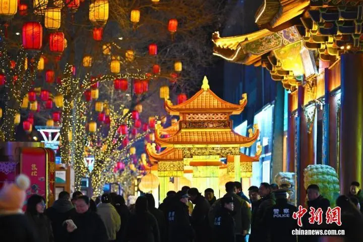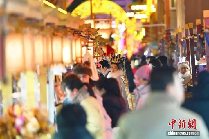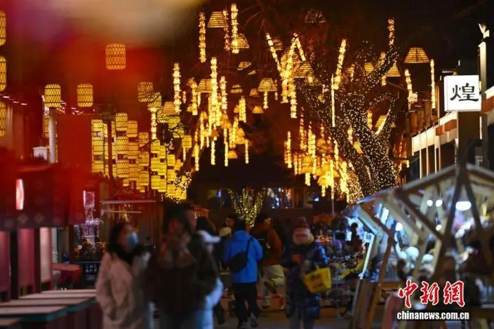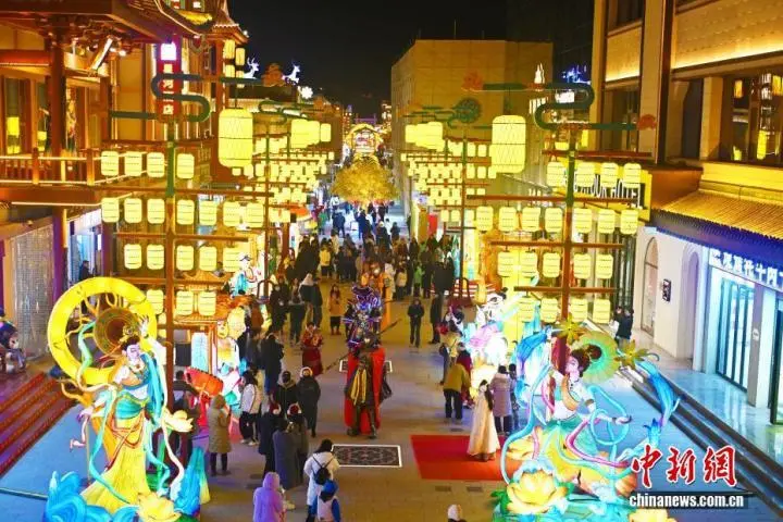 1月10日,在位于甘肃敦煌夜市内,游人参观游览“千年华彩·盛世敦煌”2026敦煌灯会。据了解,该灯会以“飞天揽月、大漠华章、十二辰光”为脉络,挖掘莫高窟壁画、敦煌遗书、丝路文化等资源,打造了22组大型主题灯组和1200余盏特色花灯,让游人仿佛穿越千年,邂逅盛唐敦煌的繁华夜景。中新社记者 李亚龙 摄