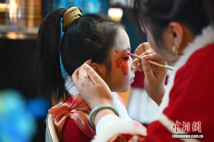 1月10日,在位于甘肃敦煌夜市内,“千年华彩·盛世敦煌”2026敦煌灯会现场小朋友画彩妆。据了解,该灯会以“飞天揽月、大漠华章、十二辰光”为脉络,挖掘莫高窟壁画、敦煌遗书、丝路文化等资源,打造了22组大型主题灯组和1200余盏特色花灯,让游人仿佛穿越千年,邂逅盛唐敦煌的繁华夜景。中新社记者 李亚龙 摄