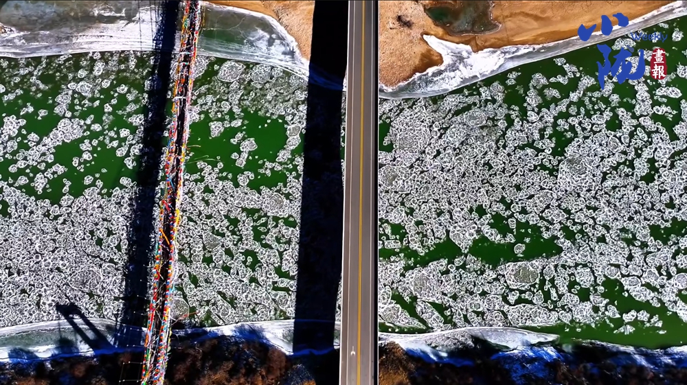 流动的黄河化为静止的冰带,与沉睡的远山、沉寂的旷野共同组成一个浩瀚、纯粹而充满张力的寒原地理空间。