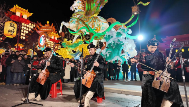 1月16日晚,肃北蒙古族自治县乌兰牧骑,亮相“千年华彩·盛世敦煌”2026敦煌灯会表演区,以一场融合蒙古族非遗技艺与现代艺术的专场演出,为这场光影盛宴注入浓郁民族风情,让市民游客在灯影流转间感受丝路文化与草原文明的碰撞交融。