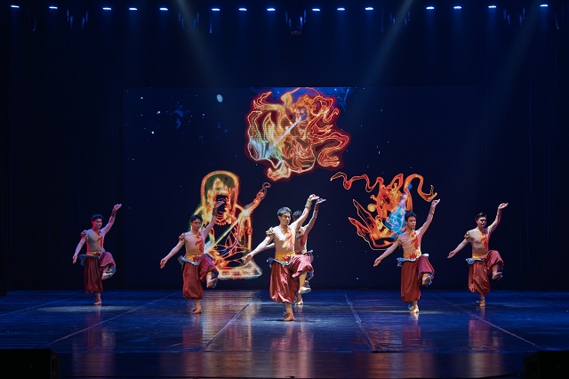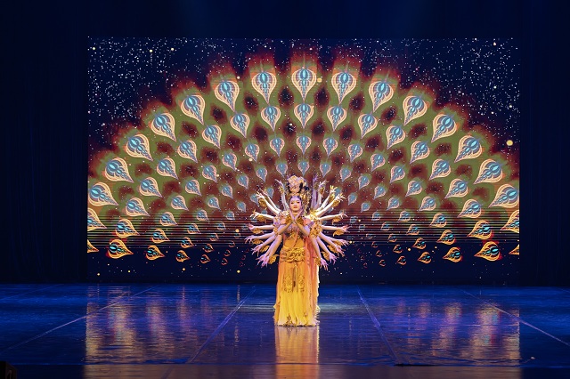 演出在被誉为“东方艺术瑰宝”的舞蹈《千手观音》中开场。演员们以精准默契的配合与优美灵动的手姿,完美诠释了敦煌莫高窟千手千眼观音的慈悲形象,瞬间震撼全场。整场节目以丝绸之路文化为核心,敦煌元素贯穿始终:《乐动敦煌—月下少年》中二胡与琵琶的深情对话,诉说着丝路之上对艺术永恒的追寻;舞蹈《反弹琵琶·伎乐天》从壁画中翩然走下,融合西域乐舞的灵动与中国古典神韵,再现了盛唐时代的艺术交融之美;男子群舞《金刚伎乐》则以雄浑刚健的舞姿,展现了壁画中护法金刚的威武气概,充满力量与阳刚之气;舞蹈《柘枝舞》则通过现代表现手法,让古老的敦煌舞姿焕发出新的生命力。