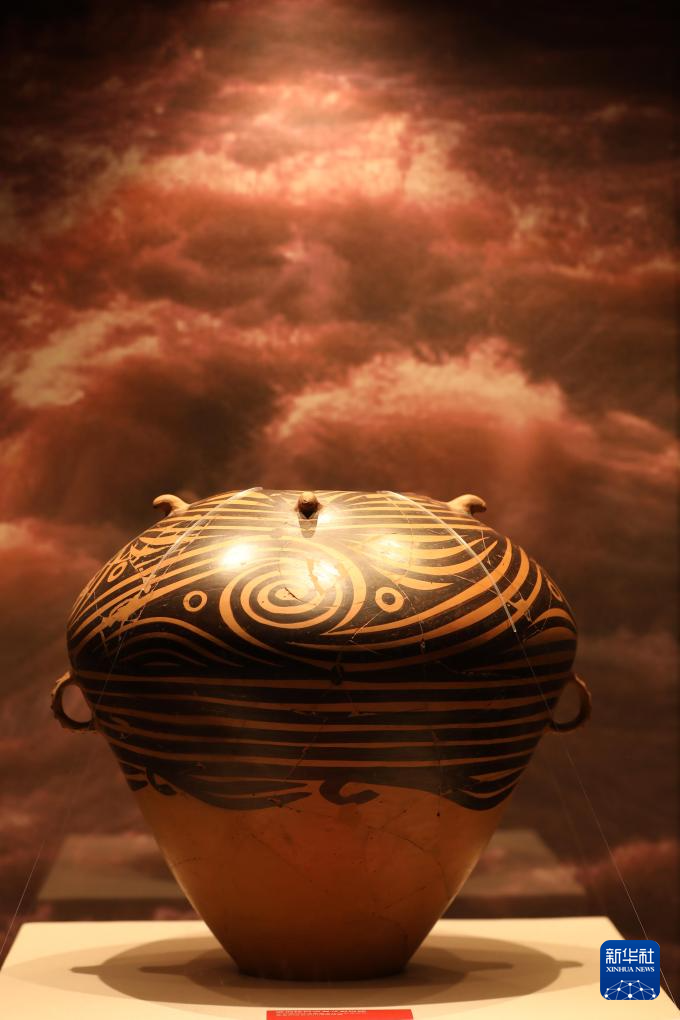这是漩涡纹四鋬双耳彩陶罐,为新石器时代马家窑文化类型的彩陶。新华社记者 张智敏 摄