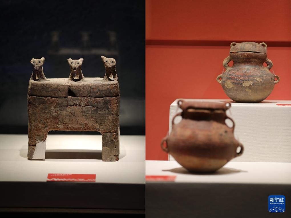 这是一张拼版照片:左图为新石器时代四坝文化的三犬钮盖彩陶方鼎,右图为新石器时代四坝文化的折线三角纹带盖六耳彩陶罐。新华社记者 张智敏 摄